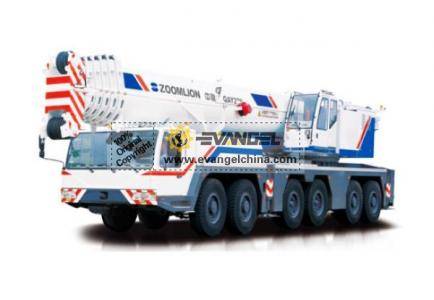 This product is an all terrain crane of full range slewing function, telescopic boom sections and electro-hydraulic proportional controlled systems. This product adopts 6-axle (4 driving axles and 5 steering axles) special purpose chassis manufactured by Zoomlion, providing wide vision, spacious cab and luxurious equipments.